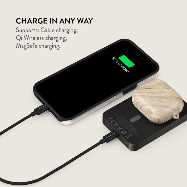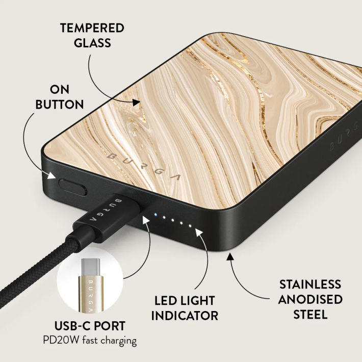 Power bank o pojemności 5000 mAh od BURGA to eleganckie źródło energii dla Twoich urządzeń, które dzięki kompaktowym wymiarom zmieści się w kieszeni czy torebce. Stylowy design i odporne na blaknięcie wzory czynią z niego dodatek, który nie tylko zasila, ale również zdobi.