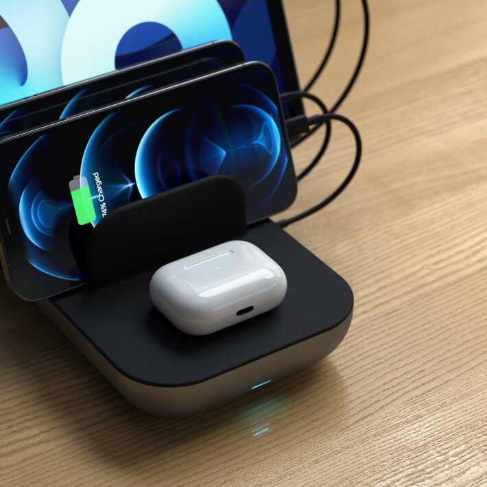 Stacja ładująca DOCK5 wyposażona jest w 2 porty USB-A oraz 2 porty USB-C PD (Power Delivery). Power Delivery to technologia szybkiego ładowania, która zapewnia jeszcze krótszy czas ładowania urządzań. Ponadto stacja posiada miejsce do ładowania bezprzewodowego, które z łatwością naładuje Twoje słuchawki bezprzewodowe lub smartfon obsługujący Qi bez konieczności używania kabli.