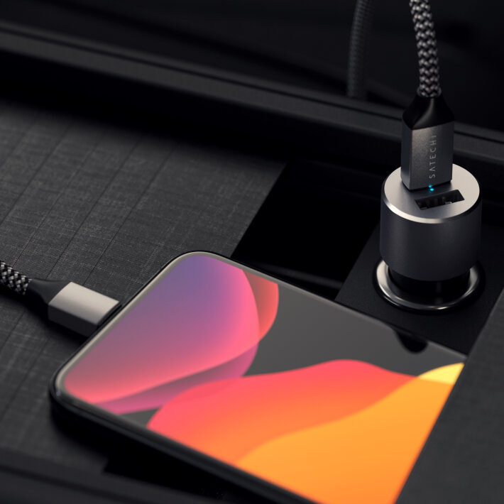 Nie pozwól, by w trasie zaskoczyła Cię rozładowana bateria. Samochodowa ładowarka Satechi ma dwa porty USB: port USB-C do szybkiego ładowania kompatybilnych laptopów, tabletów i smartfonów z mocą do 60 W oraz port USB-A do ładowania drugiego smartfona lub tabletu z mocą do 12 W.