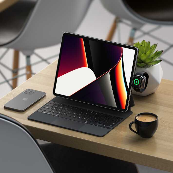 Aluminiowa obudowa ładowarki ma elegancki, nowoczesny design, który doskonale współgra z zegarkami Apple Watch i urządzeniami MacBook.