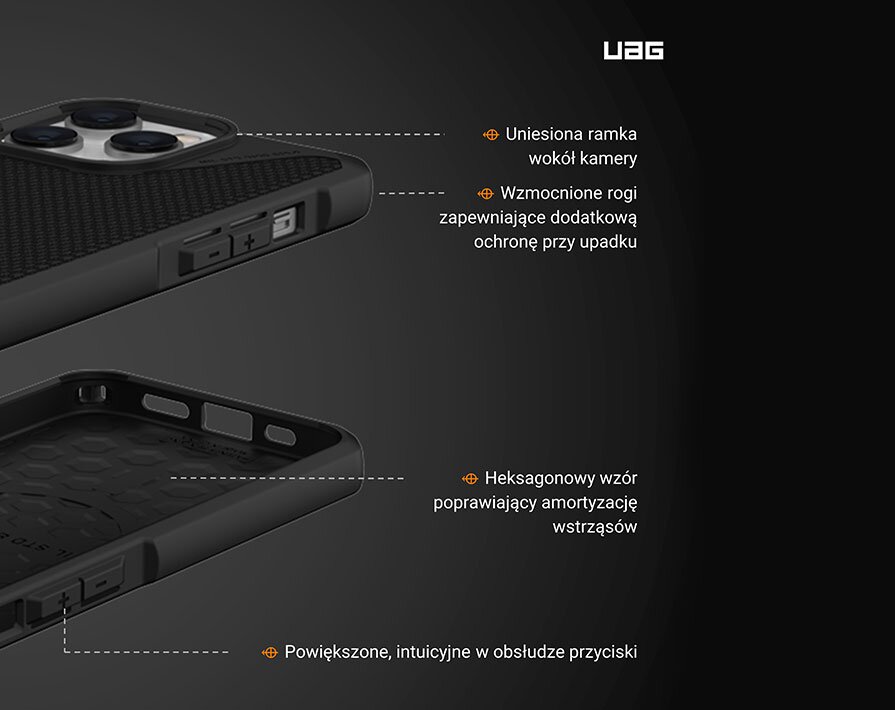 Wyprofilowane narożniki tworzą charakterystyczne dla marki UAG mocne akcenty i zabezpieczają elementy telefonu najbardziej narażone na uszkodzenia. Dodatkowo, obudowa posiada zintegrowaną kotwicę do smyczy dla pełnej wygody noszenia iPhone’a.